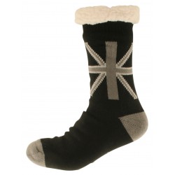 Mens Union Jack chunky knit slipper socks by Atano with a soft fleece lining & transparent non-slip grippers on the soles. One size for UK shoe size 7-11, EU 40-46. Fabric content is polyester & acrylic mix