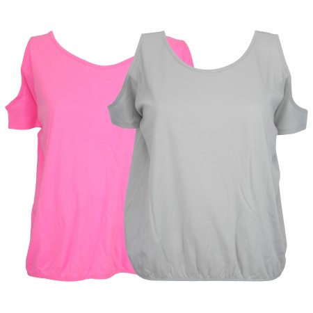Ladies 2 pack cotton short sleeved bat wing cold shoulder tops by B&C Collection. This top has a wide round neck, cut out cold shoulders & the bottom hem has a gathering effect. Offering you great value for money this short sleeved top is perfect for summer days, layering in winter or sports and gym wear. Length of garment taken from centre back, measures 48 cm approximately in the size small. Fabric content is 100% cotton. Size guide: XS UK Size 8